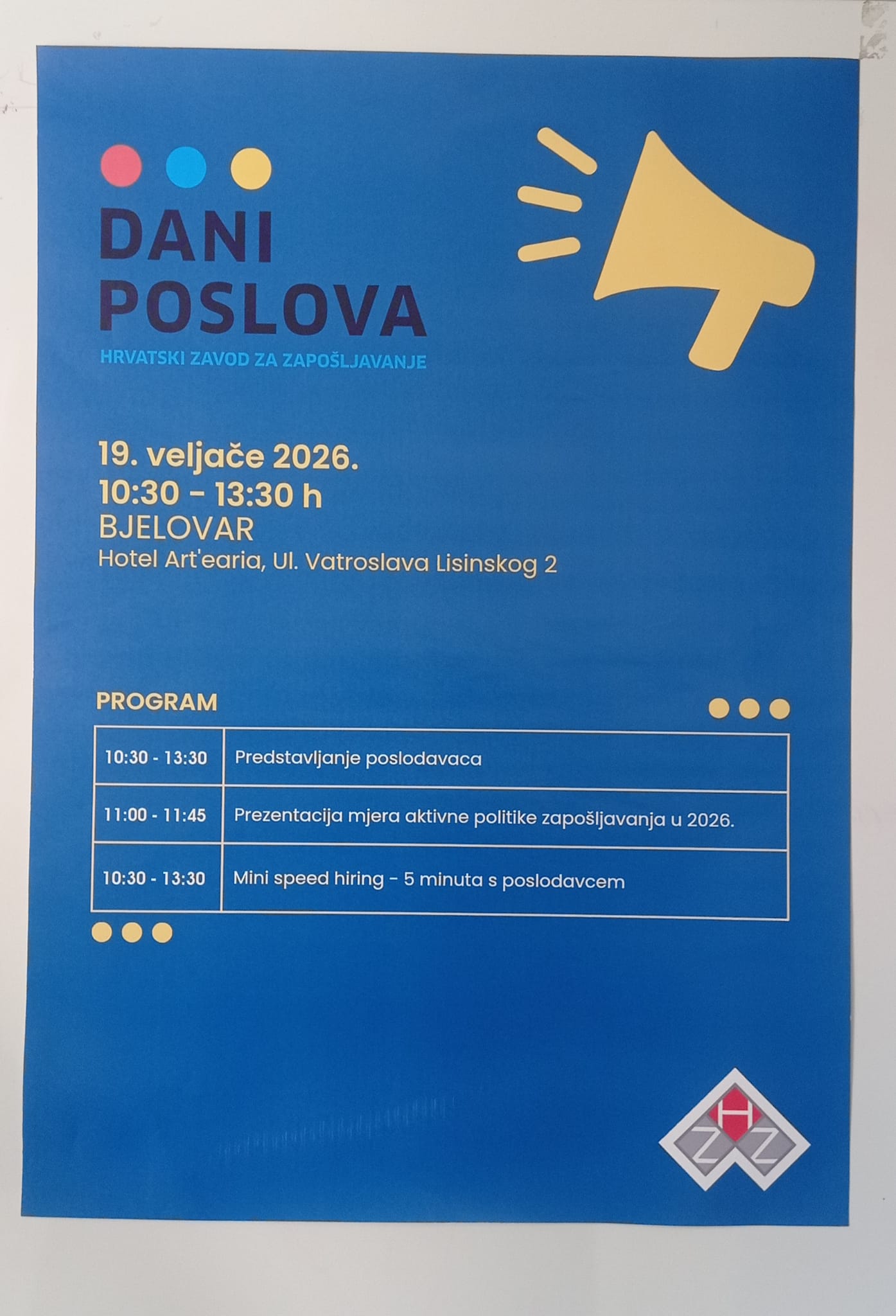 Hrvatski zavod za zapošljavanje Područni ured Bjelovar je 19. veljače održao „Dane poslova“, koji su okupili veliki broj poslodavaca, nezaposlenih osoba i učenika s ciljem povezivanja tržišta rada.